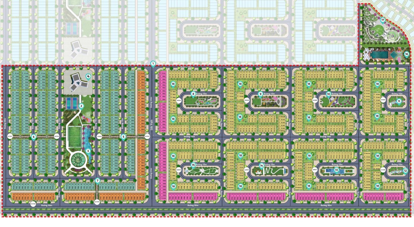 Phân khu vơi Quy mô 39ha với khoảng 1500 sản phẩm đất nền; bao gồm Sản phẩm Nền nhà phố: 6×18, 6×20; 8×20 – 3 tầng và Nền Shophouse: 6×20; 8×20 – 4 tầng; Tự do xây dựng theo mẫu quy hoạch 3 hoặc 4 tầng; Với các tiện ích nổi bật như 19 Công viên, clubhouse, trường tiểu học, hồ cảnh quan, sân tennis…; Hiện nay phân khu đã hoàn thiện pháp lý với Sổ hồng sở hữu lâu dài – Hình thành đơn vị ở và đã hoàn thiện 100{e3df68cfec9f9950815b77f228d1320f41313acbc0f06ff628e6d7ecb9e3ae6d} cơ sở hạ tầng, đèn chiếu sáng…